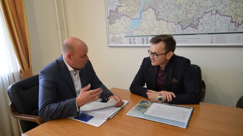 На фото: заместитель министра транспорта и дорожного хозяйства Республики Татарстан Артем Чукин и лауреат Госпремии РТ имени Алемасова Ленар Мавлиев обсуждают применение инновационных технологий в дорожной отрасли.