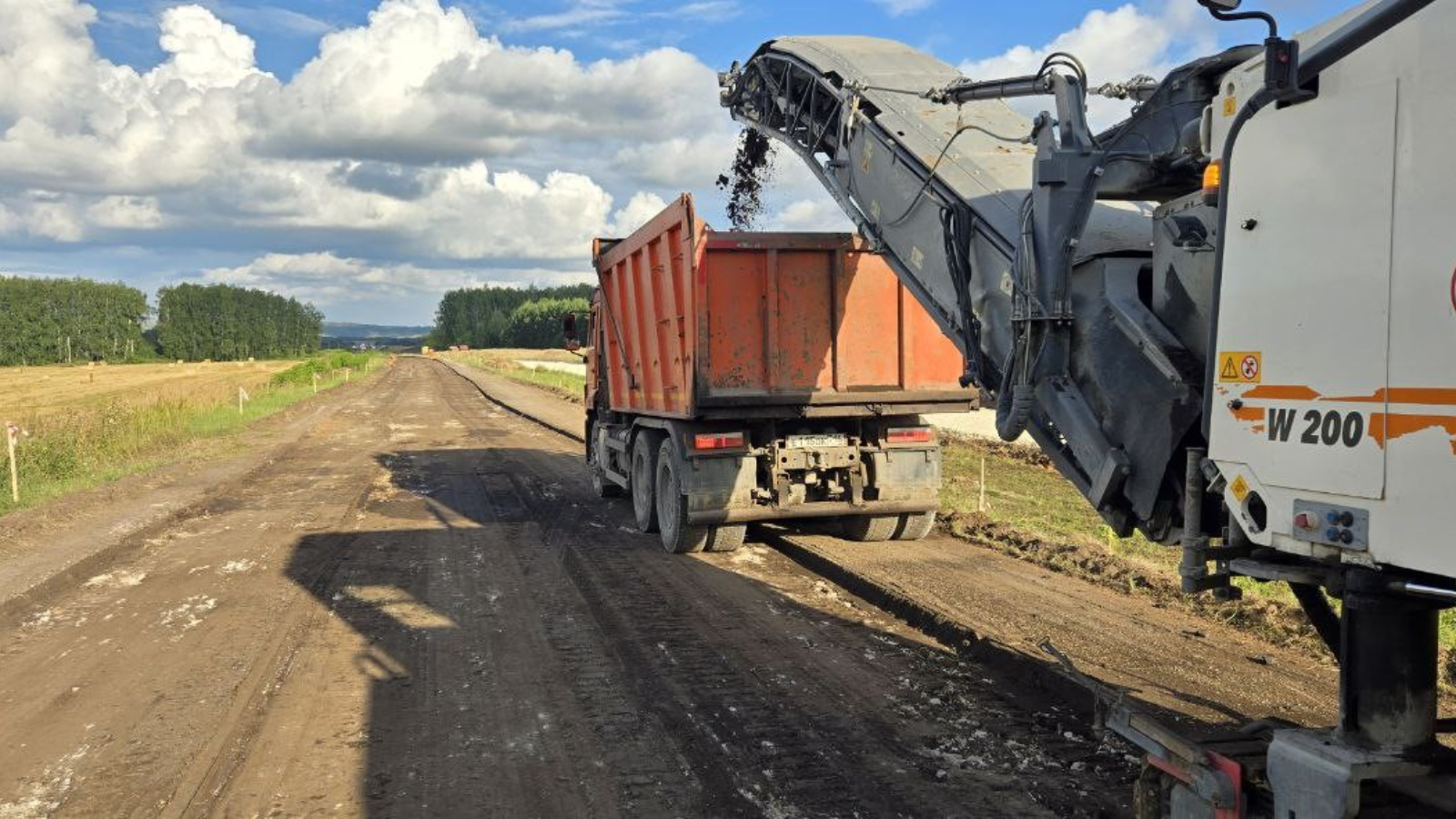 На сегодняшний день на объекте выполнены работы по снятию растительного слоя с временной объездной дороги, срезке кустарников, устройству насыпи и покрытию из щебня временной объездной дороги. Кроме того, осуществлены мероприятия по срезке поверхности существующего покрытия самоходными фрезами, устройству ровиков уширения проезжей части и демонтажу существующего основания дорожной одежды.