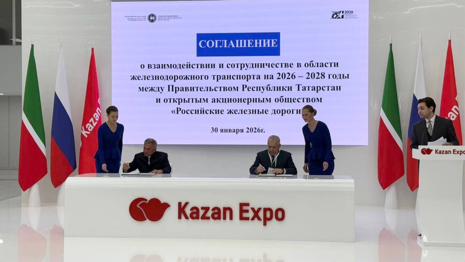 Сегодня в «Казань Экспо» в рамках итоговой коллегии Министерства транспорта и дорожного хозяйства РТ Раис Татарстана Рустам Минниханов и начальник Горьковской железной дороги — филиала ОАО «РЖД» Сергей Дорофеевский подписали соглашение о сотрудничестве в области железнодорожного транспорта на 2026-2028 годы между Правительством Республики Татарстан и ОАО «РЖД».