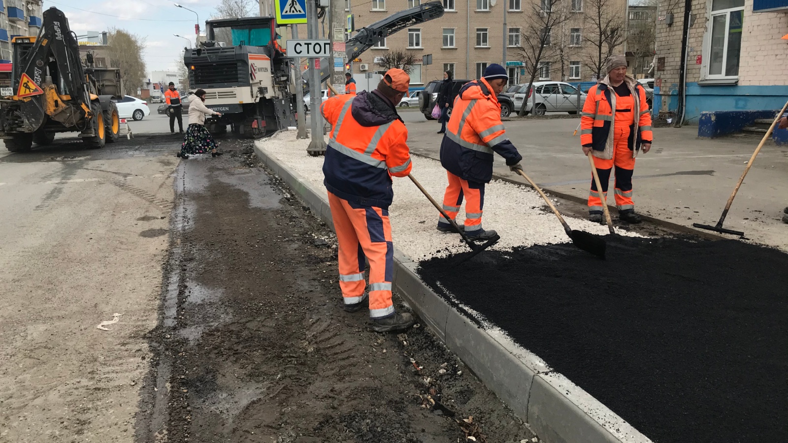 Хәзер юл төзүчеләр тротуарларны асфальтлый һәм өлешчә транспорт йөрү өлешенең өске катламын җәя башладылар.